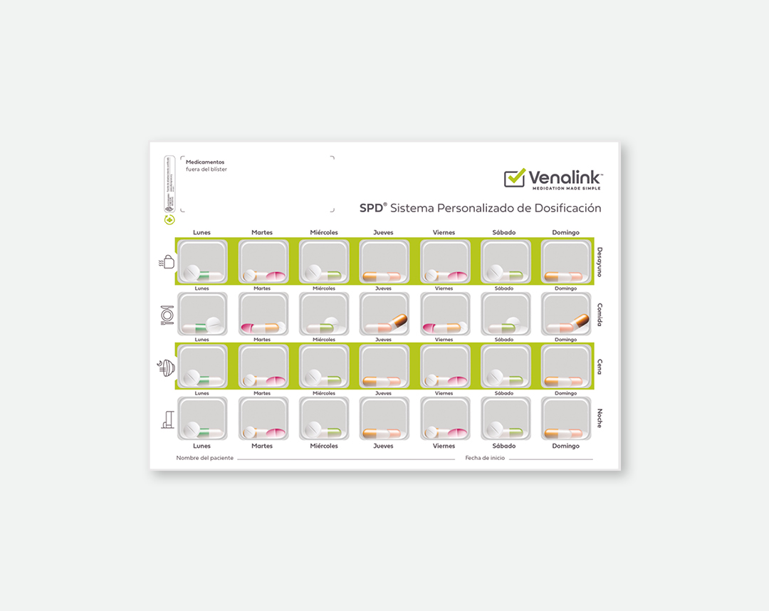 El SPD Estándar es ideal en estos casos. Su diseño claro por día y toma facilita la interpretación incluso en equipos asistenciales con cambios frecuentes.
